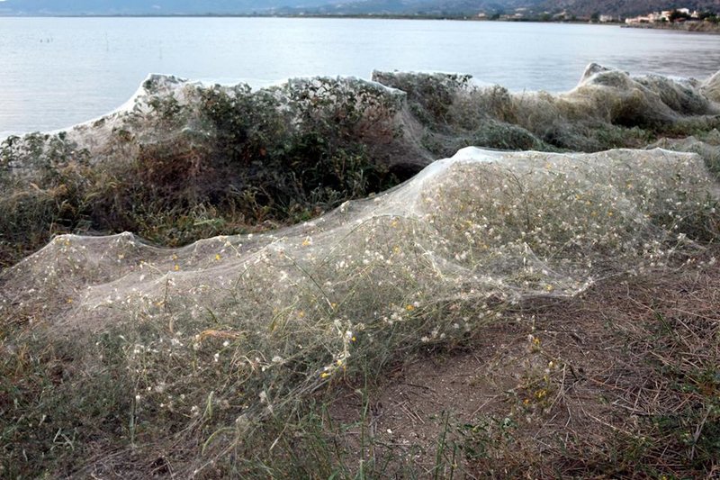 Συγκεκριμένα στην ανατολική παραλία της λιμνοθάλασσας, υπάρχει ένα τεράστιο πέπλο από αράχνες που έχει καλύψει τα φυτά (φοίνικες, αρμυρίκια και ποώδη βλάστηση) σε μήκος τουλάχιστο 300 μέτρων.