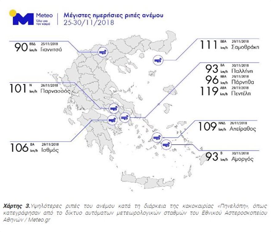 Οι ριπές των ανέμων έφτασαν τα 113 Km/h στην Πεντέλη και τα 111 km/h στη Σαμοθράκη από βόρειες διευθύνσεις, ενώ οι θυελλώδεις νοτιάδες έφτασαν τα 109 km/h στην Απείρανθο Νάξου και τα 101.4 km/h στον Παρνασσό.