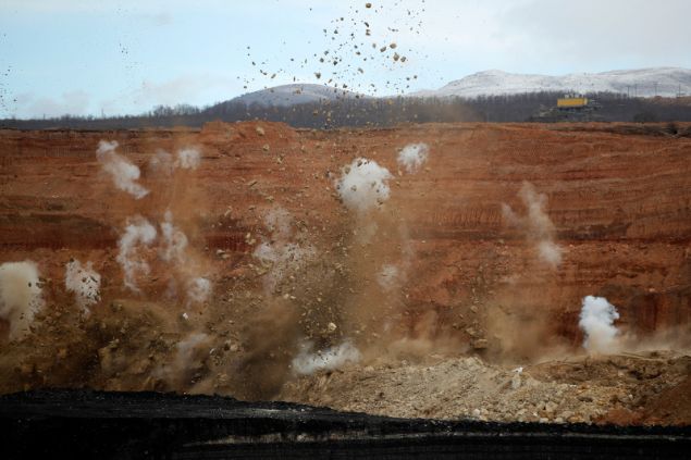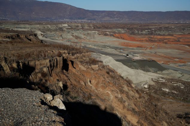Τα βαριά μηχανήματα εκσκαφής και τα οχήματα στον ορίζοντα κοντά στο χωριό μοιάζουν με φορτηγά παιχνίδια, καθώς χάνονται μπροστά στην κλίμακα των μαύρων πεδίων εξόρυξης.