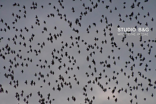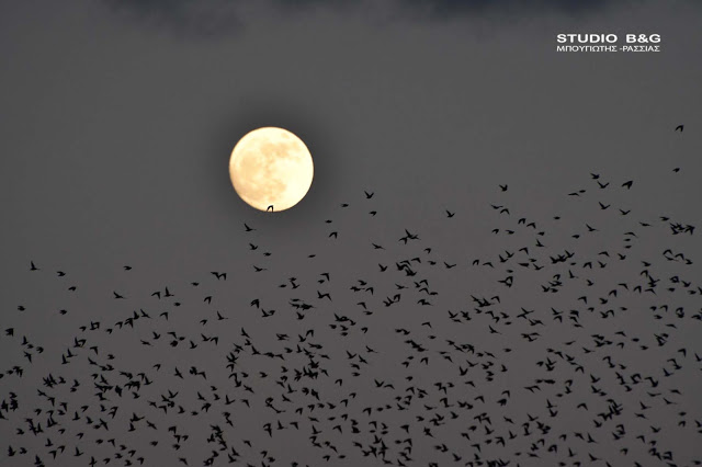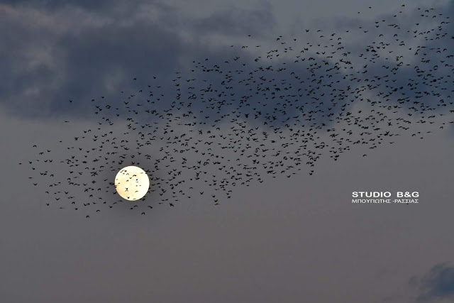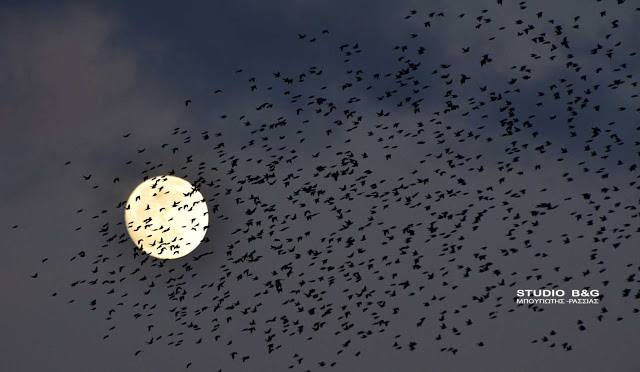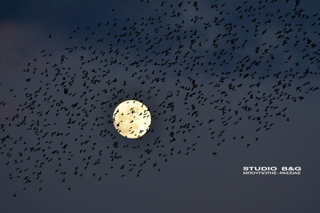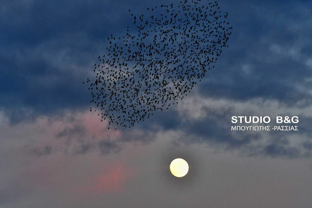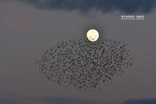 Τον εκπληκτικό χορό ενός μεγάλου σμήνους από ψαρόνια συνέλαβε ο φακός των Αργολικών Ειδήσεων το απόγευμα της 21η Δεκεμβρίου στο Ναύπλιο με φόντο τη σελήνη της χειμερινής ισημερίας καθώς ξεκινούσε η πιο μεγάλη νύχτα του χρόνου και ο Χειμώνας τουλάχιστον αστρονομικά μόλις έχει αρχίσει.