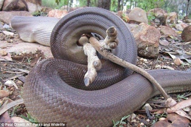 Συγκλονιστικές είναι οι φωτογραφίες που απαθανατίζουν τη στιγμή που ένας πύθωνας αιχμαλωτίζει και στην συνέχεια καταπίνει ολόκληρο ένα μικρό καγκουρό.