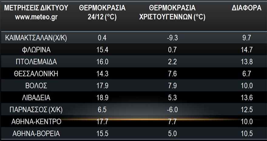 Θερμοκρασία: από -04 έως 07 βαθμούς Κελσίου. στη δυτική Μακεδονία 4 με 6 βαθμούς χαμηλότερη.