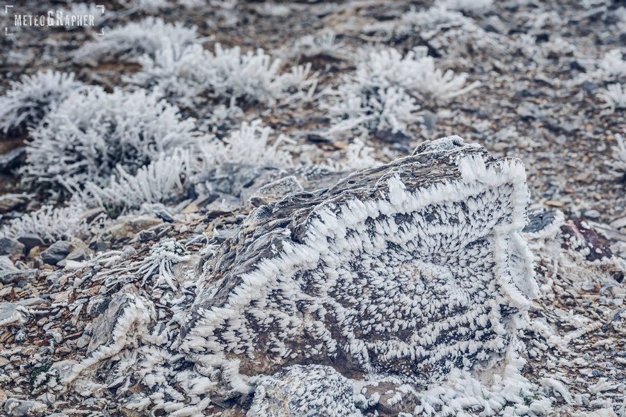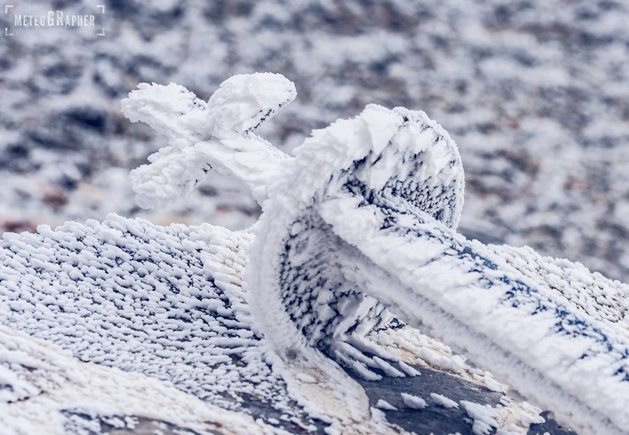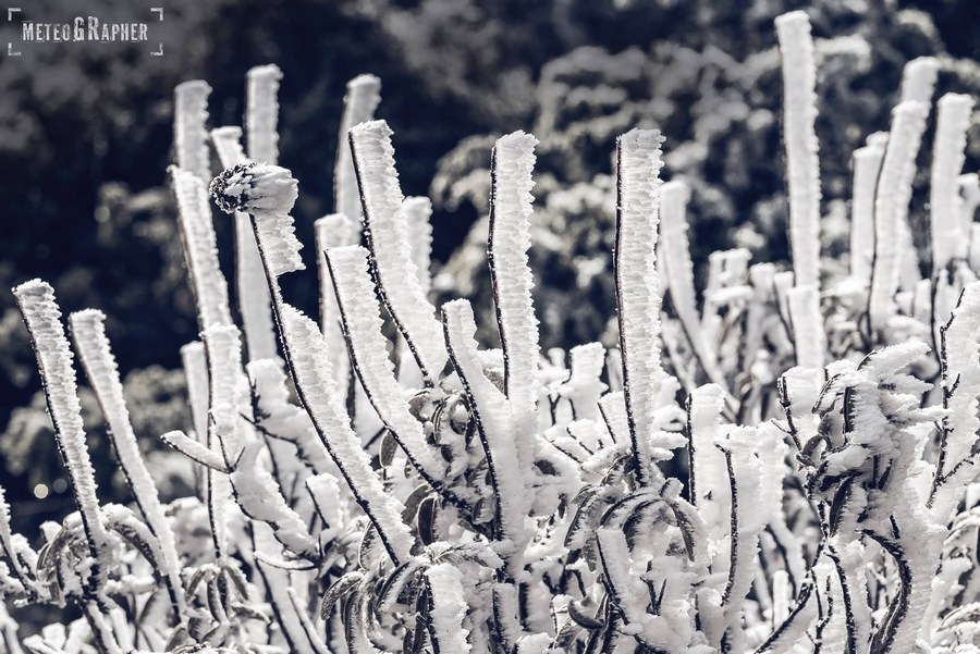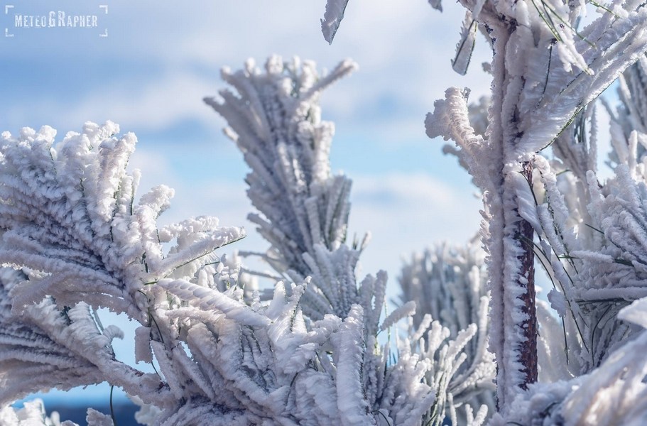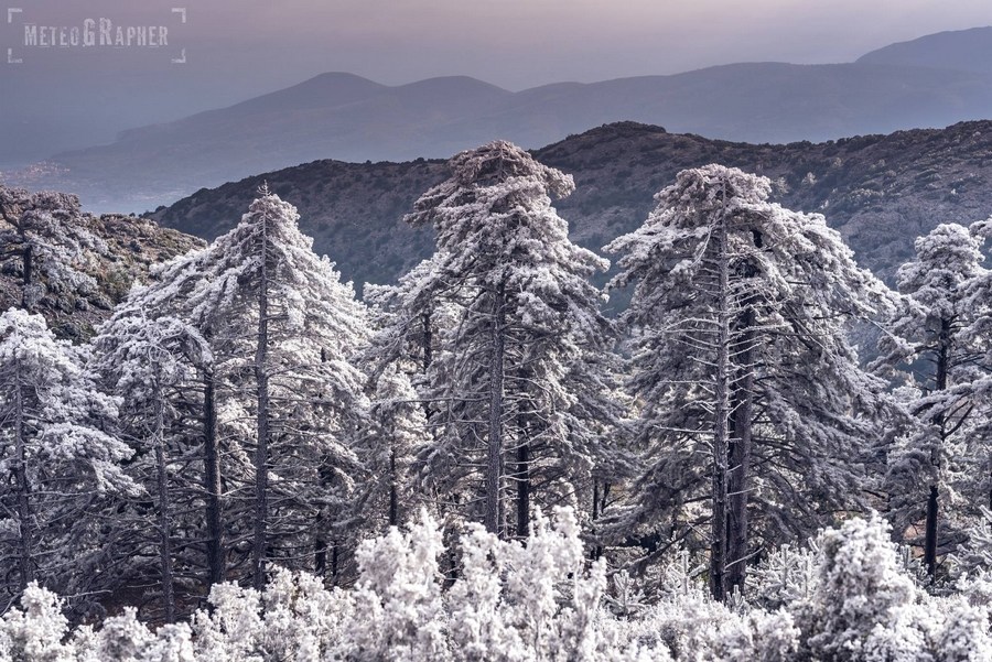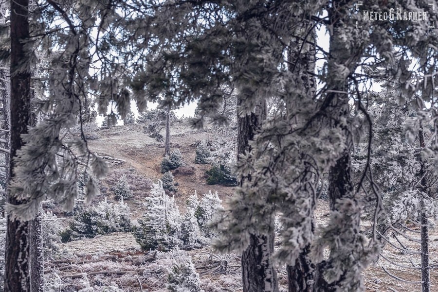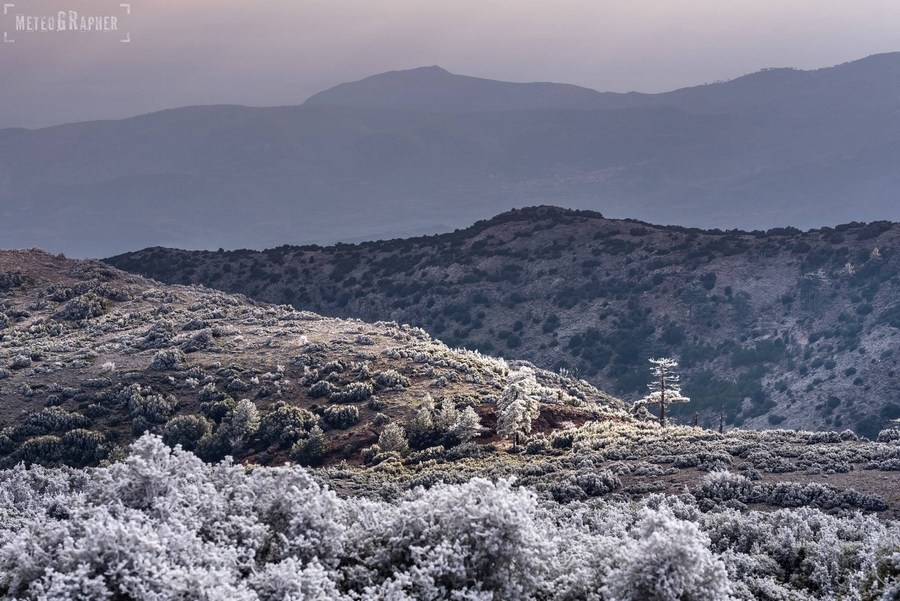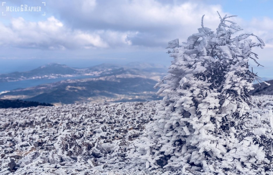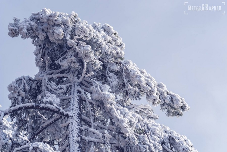 Καθώς φτάναμε στα 900 μέτρα περίπου, είδαμε με έκπληξη ότι στο έδαφος δεν υπήρχε ίχνος χιονιού παρά τα ασπρισμένα δέντρα. Ανεβαίνοντας προς το εκκλησάκι του Άη-Λια, στο σημείο που πραγματοποιείται το Αυγουστιάτικο πανηγύρι, το σκηνικό άρχισε να θυμίζει παραμύθι. Κάθε κλαδί δέντρου και κάθε θάμνος, έφερε ένα πυκνό στρώμα κρυστάλλων πάγου, οι οποίοι παραδόξως έδειχναν να έχουν αναπτυχθεί μονόπλευρα προς μία κατεύθυνση.