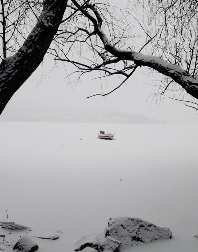 Όπως φαίνεται και στις φωτογραφίες η λίμνη έχει «ντυθεί» με έναν ολόλευκο μανδύα και θυμίζει πιο πολύ χιονισμένη πεδιάδα, παρά λίμνη.
