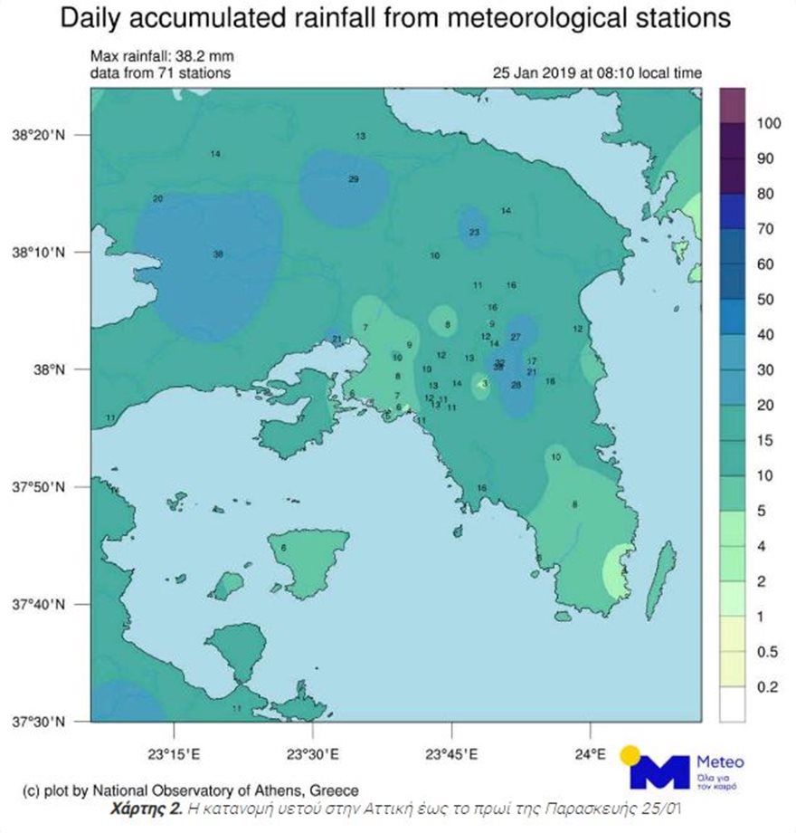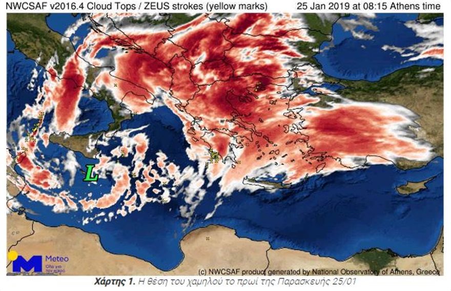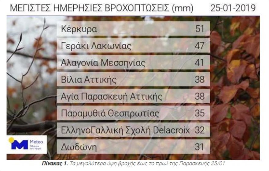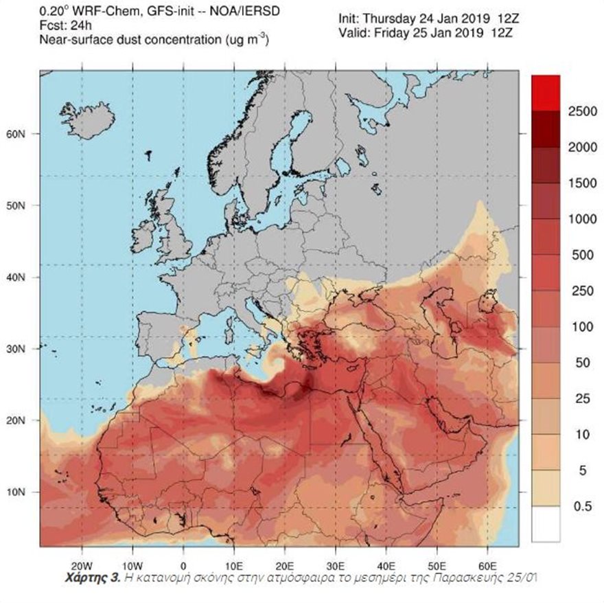 Κατά το υπόλοιπο της Παρασκευής 25/01 αναμένεται να συνεχίσουν οι βροχές, οι οποίες κατά τόπους θα είναι ισχυρές, ενώ θα εκδηλωθούν και καταιγίδες, κυρίως σε θαλάσσιες και παράκτιες περιοχές. Χιονοπτώσεις θα σημειωθούν στα βόρεια ορεινά. Τα φαινόμενα στην Ήπειρο, τη Θεσσαλία και τη Δυτική Μακεδονία θα εξασθενήσουν σημαντικά από το απόγευμα. Οι άνεμοι στο Αιγαίο θα πνέουν από νότιες και νοτιοδυτικές διευθύνσεις έως 9 μποφόρ, με πολύ υψηλό κυματισμό, ενώ στο Ιόνιο από βορειοδυτικές διευθύνσεις έως 7 μποφόρ. Η θερμοκρασία δεν θα παρουσιάσει αξιόλογη μεταβολή. Επιπρόσθετα, μεγάλη συγκέντρωση αφρικανικής σκόνης θα παρατηρηθεί στη Νότια Ελλάδα (Χάρτης 3), κυρίως στην Κρήτη όπου θα σημειωθούν και λασποβροχές.