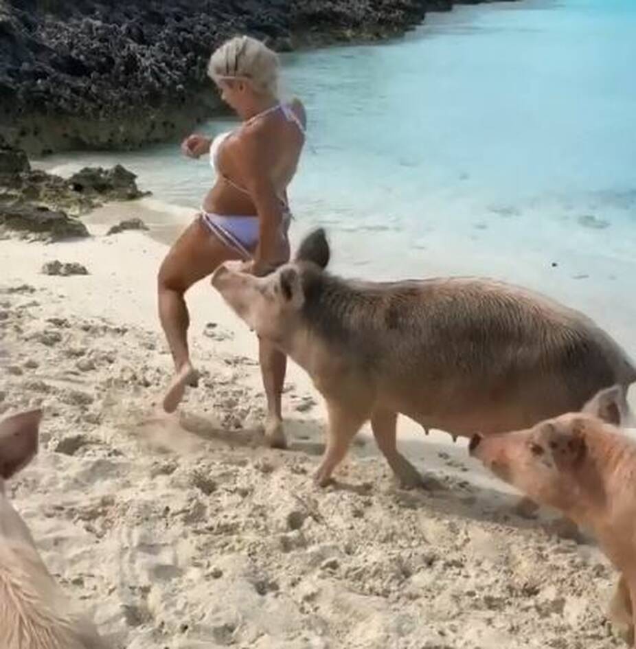 Συγκεκριμένα, η 32χρονη βρισκόταν στο νησί Big Major Cay, που έχει γίνει γνωστό για τα γουρούνια που κάνουν βουτιές στη θάλασσα. Πολλά μοντέλα το έχουν επισκεφθεί και έχουν κολυμπήσει με τα γουρούνια, όπως η Ιρίνα Σάικ.