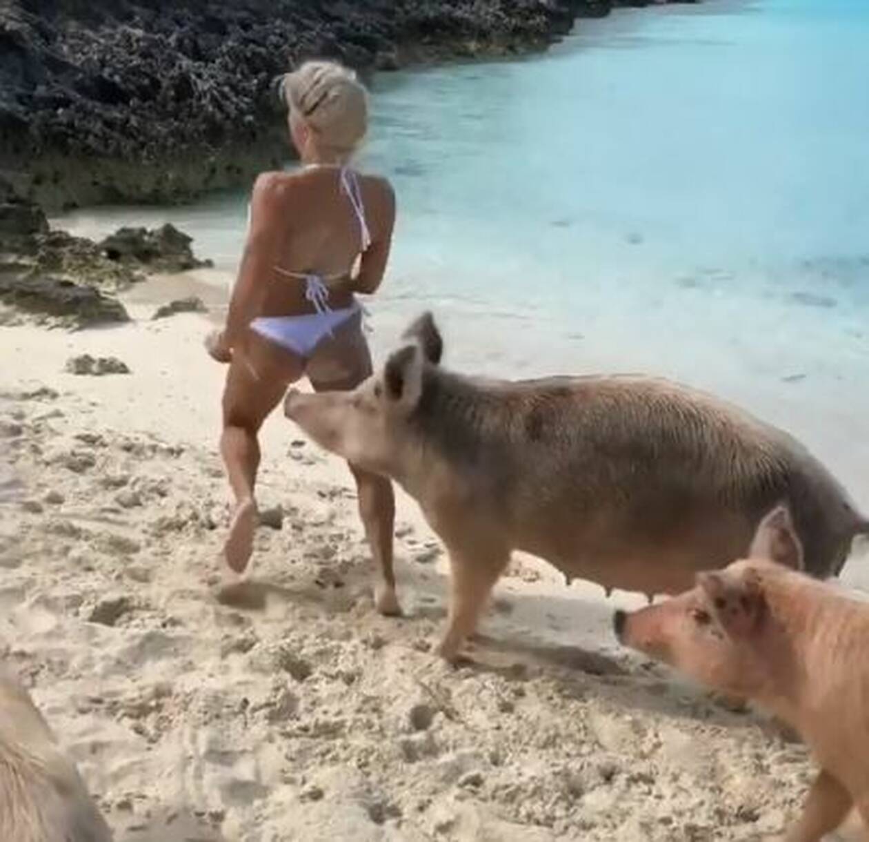 Δεν πρόλαβε να χαρεί τις ανέμελες στιγμές του στην παραλία το εκρηκτικό μοντέλο από τη Βενεζουέλα, Michelle Lewin που απολάμβανε τις διακοπές της στις Μπαχάμες, όταν… δέχθηκε την επίθεση από γουρούνια.