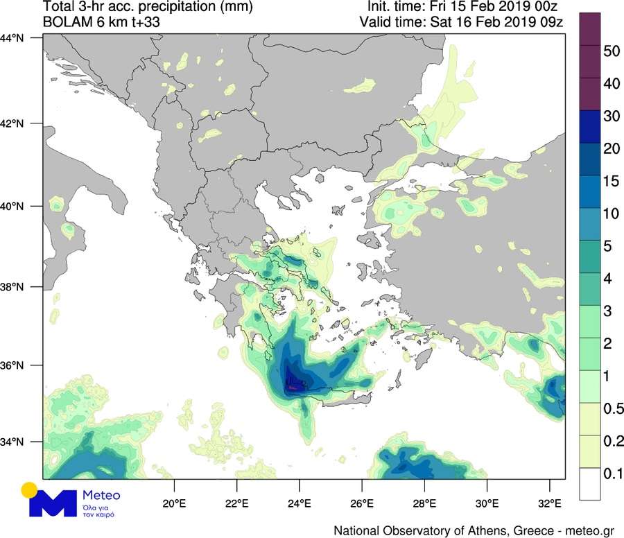 Εως και το μεσημέρι του Σαββάτου, οι βροχοπτώσεις στο Νότιο Αιγαίο θα είναι τοπικά ισχυρές, επηρεάζονται εκ νέου σημαντικά τα δυτικά κυρίως τμήματα της Κρήτης, όπως φαίνεται και στο χάρτη που ακολουθεί. Στο χάρτη απεικονίζονται οι περιοχές όπου θα εκδηλώνονται φαινόμενα τις πρωινές ώρες του Σαββάτου 16/02.