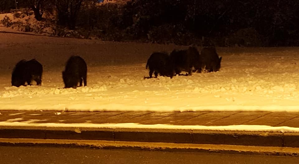 Βόλτα στο νυχτερινό, χιονισμένο τοπίο, στο Πανόραμα Θεσσαλονίκης, έκανε ένα κοπάδι από αγριογούρουνα, εκπλήσσοντας το βράδυ του Σαββάτου περίοικους, αλλά και διερχόμενους οδηγούς.