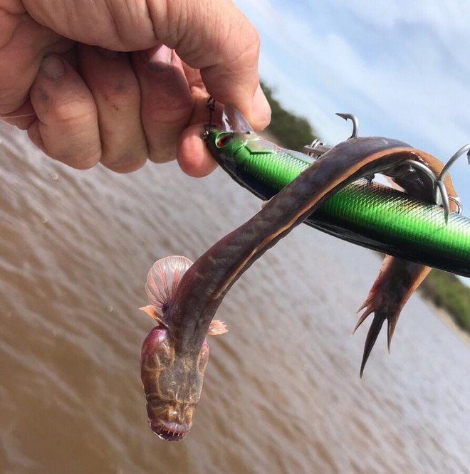 Και πρόσθεσε: “Έχουν μη ανεπτυγμένα ολοκληρωτικά μάτια, τα οποία συχνά είναι καλυμμένα από δέρμα επειδή ζουν σε θολό νερό και βασίζονται στην αφή και όχι στην όραση για να πιάσουν το θήραμά τους. Γι’ αυτό και έχουν τόσο κοφτερά δόντια. Όταν βρουν το γεύμα του, δεν θέλουν να το αφήσουν να φύγει”.