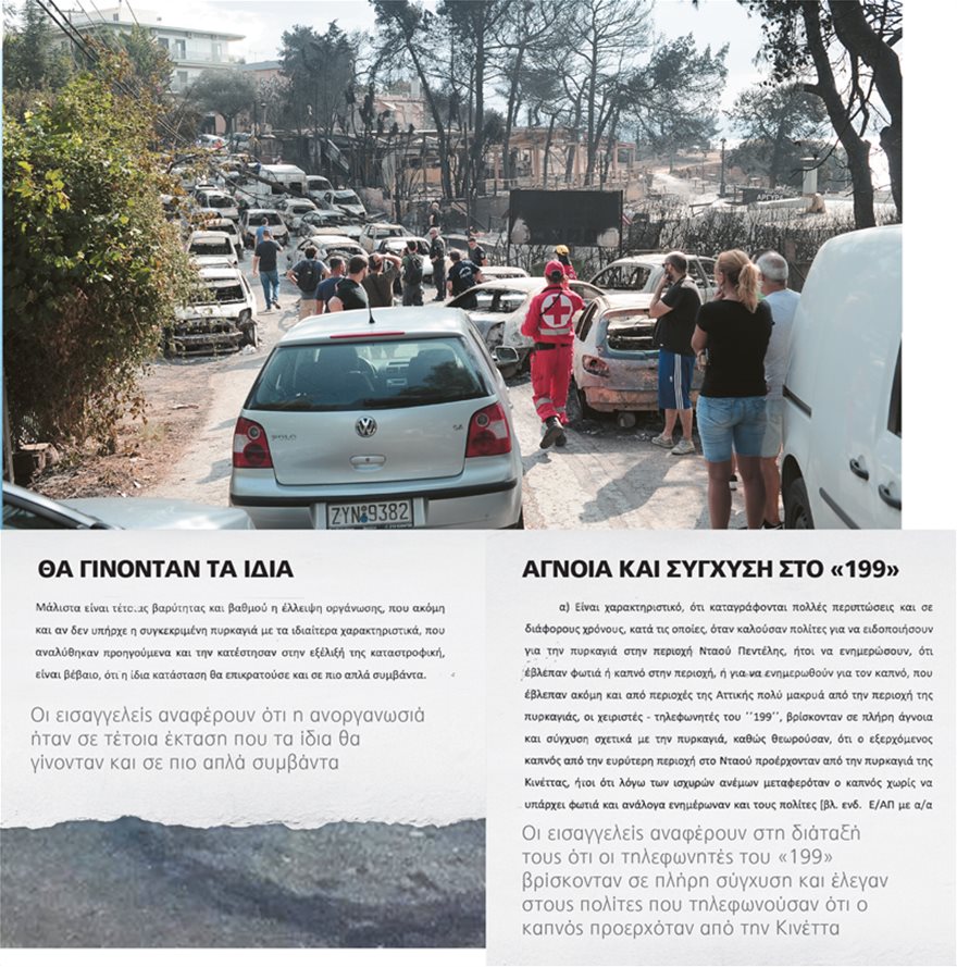 12 Λειτουργούσαν «συμπτωματικά»: «Από το περιεχόμενο των συνομιλιών αυτών» -αναφέρεται στη διάταξη- «επιβεβαιώνεται η απόλυτη έλλειψη οργάνωσης και συντονισμού των πυροσβεστικών δυνάμεων, οι οποίες φαίνεται να λειτουργούσαν εντελώς συμπτωματικά» και χωρίς έστω «στοιχειώδη σχεδιασμό για την αντιμετώπιση της συγκεκριμένης πυρκαγιάς». Οπως υπογραμμίζουν οι εισαγγελείς, ήταν «τέτοιας βαρύτητας και βαθμού η έλλειψη οργάνωσης, που ακόμη και αν δεν υπήρχε η συγκεκριμένη πυρκαγιά με τα ιδιαίτερα χαρακτηριστικά που την κατέστησαν στην εξέλιξή της καταστροφική, είναι βέβαιο ότι η ίδια κατάσταση θα επικρατούσε και σε πιο απλά συμβάντα».