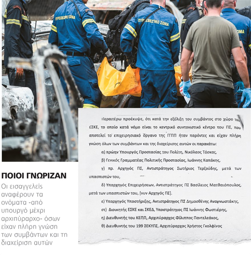 10 Ηταν όλοι ενήμεροι για την κατάσταση πριν από τις 5.00 μ.μ.: Πλήρη γνώση για την πυρκαγιά στο Νταού Πεντέλης και των ενεργειών που υπήρξαν για τη διαχείρισή της είχαν πριν από τις 5 το απόγευμα της 23ης Ιουλίου όλοι όσοι βρίσκονταν στον χώρο του ΕΣΚΕ, με πρώτο τον πρώην υπουργό Προστασίας του Πολίτη Νικόλαο Τόσκα, αναφέρουν οι εισαγγελείς. Γνώση είχαν επίσης οι: Ιωάννης Καπάκης, τότε γενικός γραμματέας Πολιτικής Προστασίας, Σωτήρης Τερζούδης, πρώην αρχηγός του Πυροσβεστικού Σώματος, Βασίλειος Ματθαιόπουλος, υπαρχηγός Επιχειρήσεων τότε, σήμερα αρχηγός του Πυροσβεστικού Σώματος, αντιστράτηγος Πυροσβεστικού Σώματος, Δημοσθένης Αναγνωστάκης, υπαρχηγός Υποστήριξης, αντιστράτηγος Π.Σ., Ιωάννης Φωστιέρης, διοικητής ΕΣΚΕ και ΣΚΕΔ, Φίλιππος Παντελεάκος, διευθυντής του ΚΕΠΠ, αρχιπύραρχος και Χρήστος Γκολφίνος, διευθυντής του «199» ΣΕΚΥΠΣ, αρχιπύραρχος.