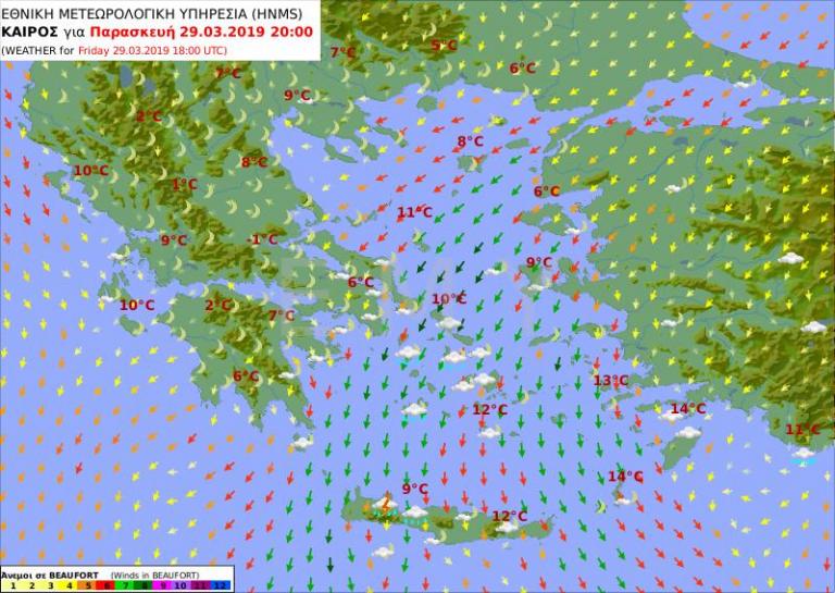 Βαθμιαία από το απόγευμα τα φαινόμενα θα εξασθενήσουν και τη νύχτα θα περιοριστούν στη νότια νησιωτική χώρα. Οι άνεμοι ανατολικοί βορειοανατολικοί 5 με 7, στα ανατολικά και βαθμιαία στα νότια 8 και πιθανώς τοπικά 9 μποφόρ. Η θερμοκρασία σε περαιτέρω πτώση, θα κυμανθεί σε χαμηλά για την εποχή επίπεδα.