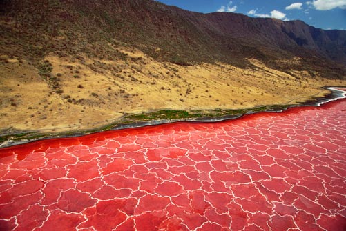 Στο βόρειο τμήμα της Τανζανίας, κοντά στα σύνορα με την Κένυα, το τοπίο μοιάζει εξωγήινο, καθώς στην περιοχή δεσπόζει η παράδοξη «ραγισμένη» λίμνη Natron. Ανάμεσα σε ηφαιστειακούς λόφους και μεγάλους κρατήρες, 600 μέτρα πάνω από την επιφάνεια της θάλασσας απλώνεται σε μεγάλη έκταση ίσως το πιο… καυστικό σώμα νερού στον κόσμο. Η λίμνη τροφοδοτείται από θερμές πηγές πλούσιες σε μεταλλικά άλατα, κυρίως ανθρακικό νάτριο (natron), ενώ τα κυανοβακτήρια που εμπεριέχονται στο νερό είναι υπεύθυνα για το κόκκινο χρώμα της.