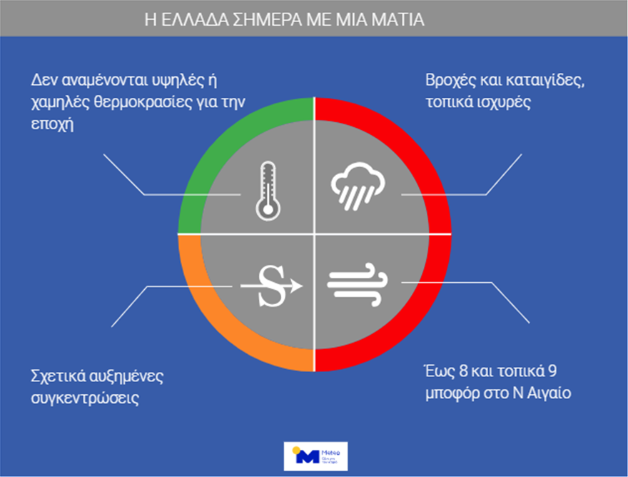 Σύμφωνα με το meteo.gr σε όλη τη χώρα θα επικρατήσουν σήμερα βροχές και καταιγίδες ενώ τα ισχυρότερα φαινόμενα θα εντοπίζονται στη νότια ηπειρωτική χώρα έως το μεσημέρι και στα βόρεια και ανατολικά ηπειρωτικά και το βόρειο και ανατολικό Αιγαίο στη συνέχεια.