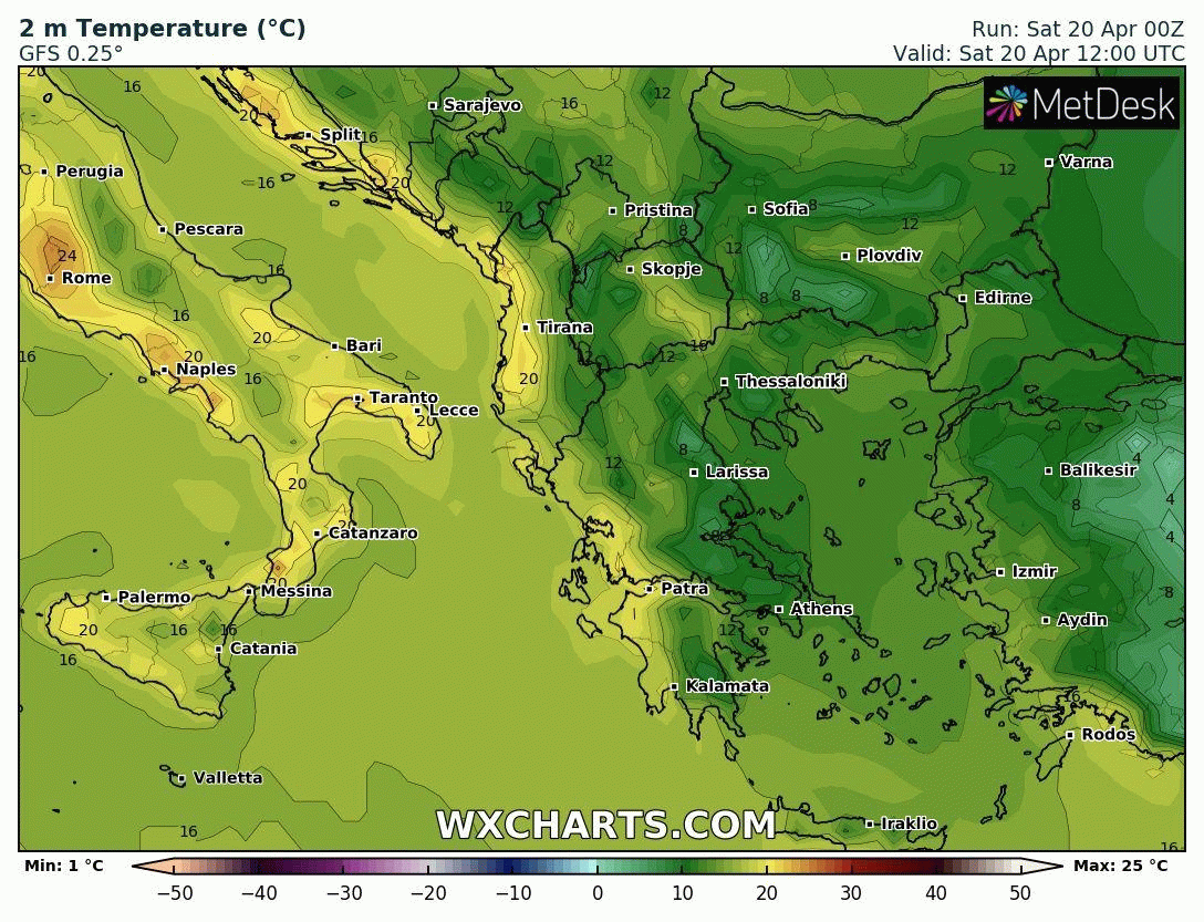 Δείτε στον ακόλουθο χάρτη την εξέλιξη των θερμοκρασιών: