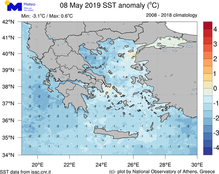 Οι χαμηλές θερμοκρασίες και οι ισχυροί άνεμοι στη χώρα μας, που είχαν επικρατήσει το προηγούμενο διάστημα, επηρεάζουν και τη θάλασσα με μια χρονική διαφορά μερικών ημερών, οδηγώντας σε αρνητική απόκλιση μετά από πολλούς μήνες κατά το 2018 και τις αρχές του 2019, όταν η επιφανειακή θερμοκρασία των ελληνικών θαλασσών κυμαινόταν κοντά στον μέσο όρο των τελευταίων 11 ετών.