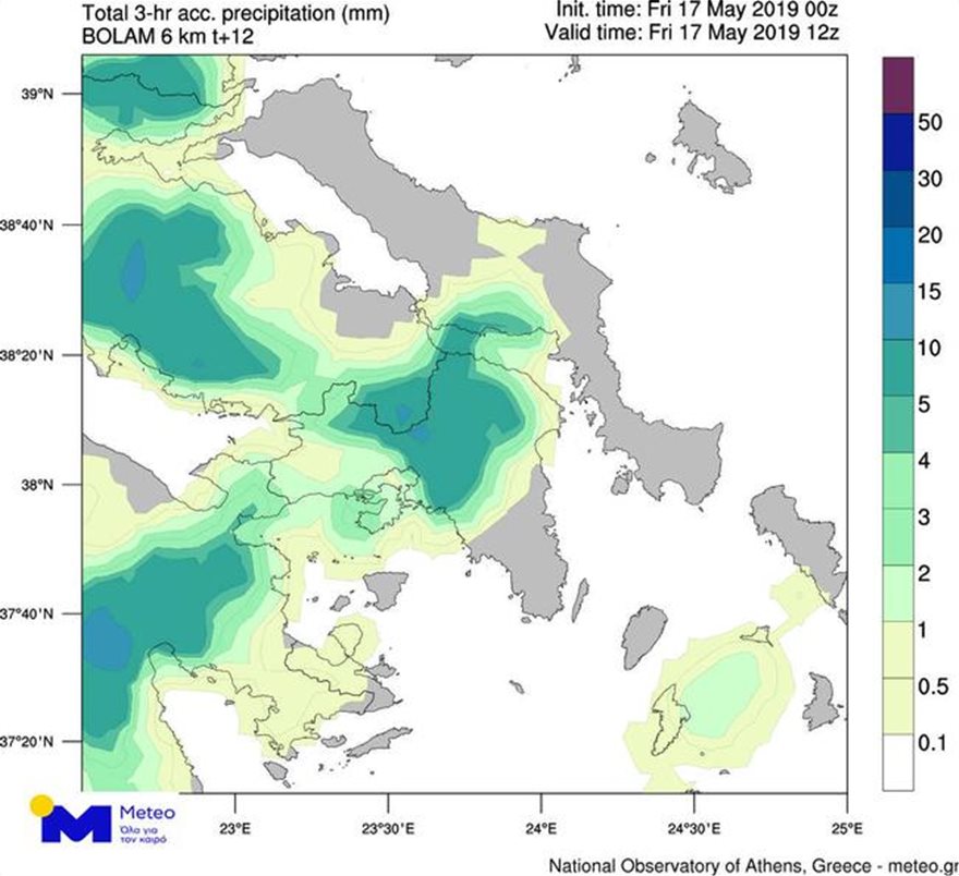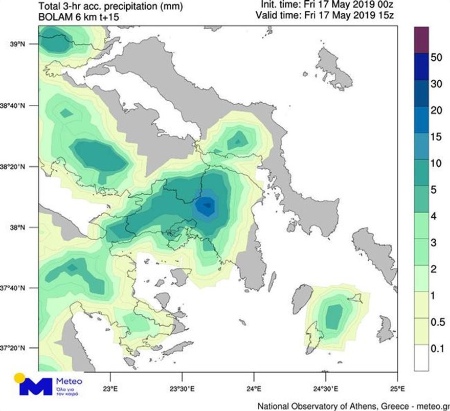 Στον χάρτη που ακολουθεί παρουσιάζεται η εκτιμώμενη κατανομή των βροχοπτώσεων τις απογευματινές ώρες της Παρασκευής 17/05.