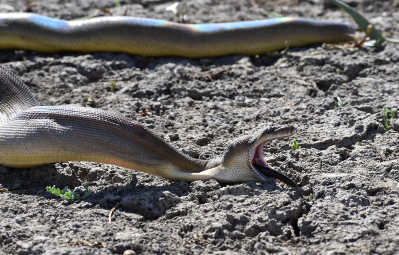 Αρχικά, διαπίστωσαν ότι από το στόμα του ερπετού έβγαινε κάποιο άλλο είδος φιδιού ή σαύρας, κάνοντάς τους να πιστέψουν ότι πρόκειται για κάποιο από τα δεκάδες μικρότερα είδη φιδιών της περιοχής, όμως λίγα λεπτά αργότερα συνειδητοποίησαν πως θύμα του τετράμετρου πύθωνα ήταν ένα ακόμα μεγαλύτερο φίδι του ίδιου είδους, το οποίο είχε βρει άδοξο τέλος από τους τεράστιους και δυνατούς μυς του «κανίβαλου» ανταγωνιστή του.