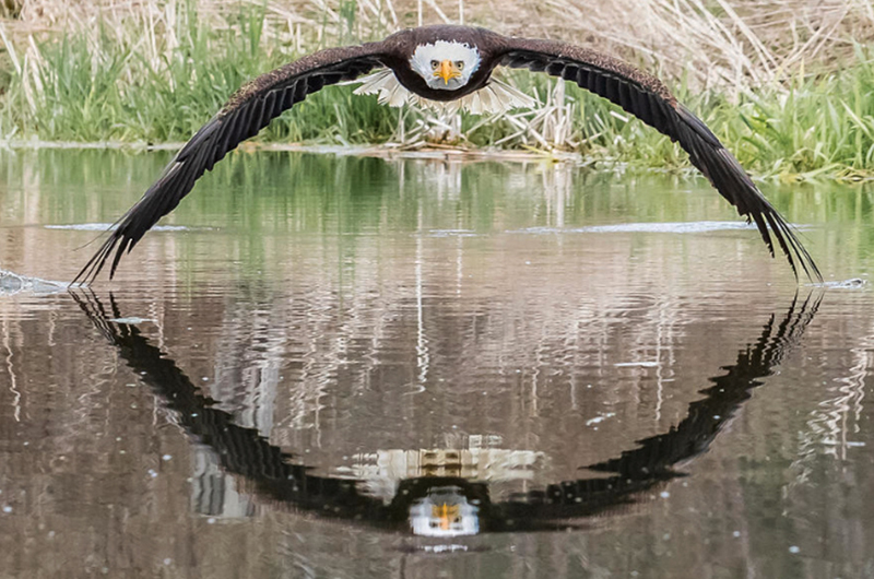 Σε αυτή αποτυπώνεται ο Μπρους, ένας φαλακρός αετός, στο καναδικό καταφύγιο άγριων ζώων Raptor. Ο αετός πετά πάνω από το νερό, ενώ αντικατοπτρίζεται σε αυτό. Το αποτέλεσμα εντυπωσιακό. «Ο αετός πετούσε κυριολεκτικά πάνω από το κεφάλι μου, εκεί που καθόμουν. Ηταν μια καταπληκτική εμπειρία», έγραψε στο Facebook.