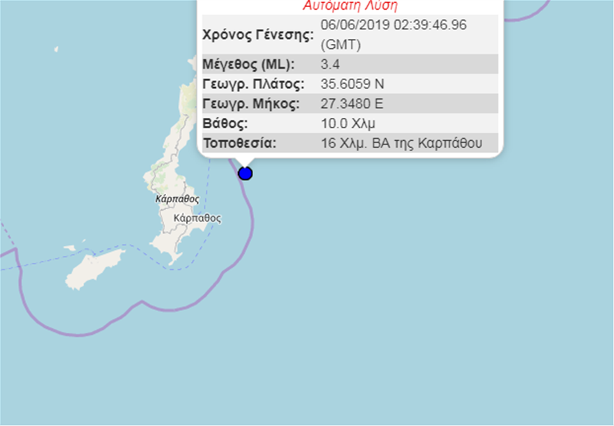Πιο συγκεκριμένα, στις 5:39 το πρωί της Πέμπτης, σημειώθηκε σεισμική δόνηση μεγέθους 3,4 βαθμών της κλίμακας Ρίχτερ και επίκεντρο 16 χιλιόμετρα βορειοανατολικά της Καρπάθου.