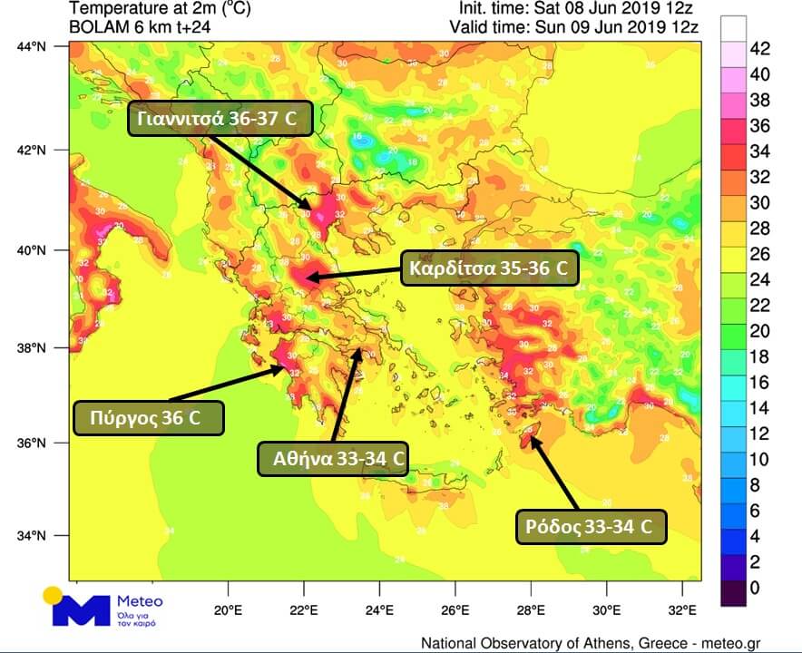Οι υψηλότερες θερμοκρασίες θα σημειωθούν στην πεδιάδα της Θεσσαλίας όπου θα φτάσουν στους 35-36 βαθμούς, στην πεδιάδα των Γιαννιτσών όπου θα φτάσουν στους 36-37 βαθμούς και στην Ηλεία όπου θα φτάσουν στους 36 βαθμούς Κελσίου, σύμφωνα με το meteo.gr.