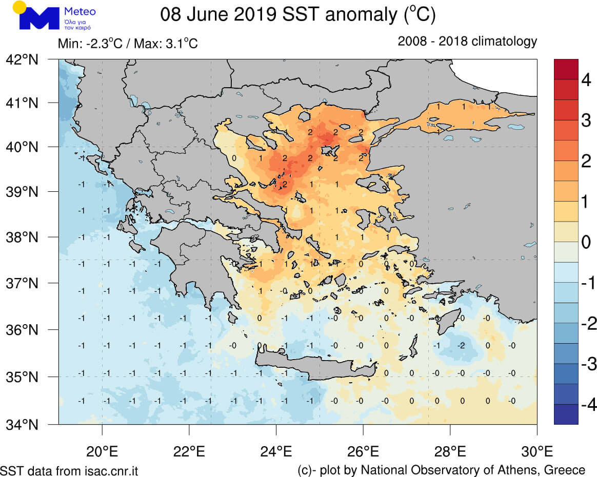 Ο χάρτης δείχνει τη δορυφορική εκτίμηση για την απόκλιση της θερμοκρασίας στην επιφάνεια της θάλασσας από τη μέση τιμή της περιόδου 2008 – 2018 το Σάββατο 8 Ιουνίου 2019. Τη μεγαλύτερη θετική απόκλιση παρατηρείται στο Βόρειο Αιγαίο (22-24°C) ενώ στο Ιόνιο και το Κρητικό Πέλαγος η θερμοκρασία του νερού παραμένει ελαφρώς χαμηλότερη από τις φυσιολογικές για τη εποχή τιμές (20-22ºC).