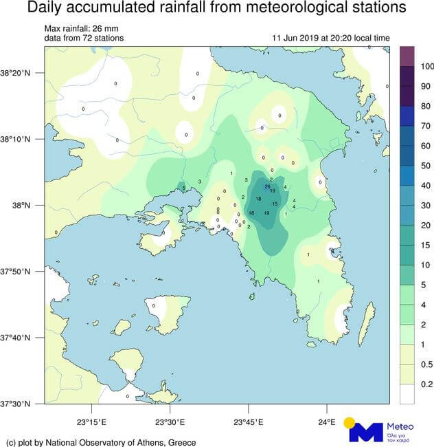 Στο χάρτη που ακολουθεί φαίνεται η γεωγραφική κατανομή των βροχοπτώσεων που σημειώθηκαν στην Αττική έως τις 20:30.