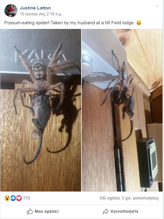 Η Justine έσπευσε ωστόσο να απαθανατίσει το τρομακτικό… γεύμα και έπειτα να αναρτήσει τις φωτογραφίες σε ομάδα του Facebook, η οποία έχει να κάνει με έντομα και αράχνες της Τασμανίας. Δεν χρειάστηκε να περάσει πολλή ώρα για να αρχίσουν να κάνουν το γύρο του Διαδικτύου.