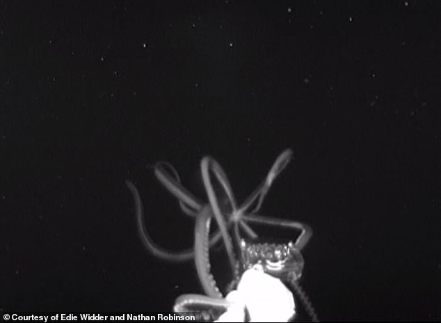 Μέσα από το βαθύ σκοτάδι και σχεδόν πενήντα μέτρα από την επιφάνεια του νερού, ένα νεαρό γιγαντιαίο καλαμάρι έκανε την εμφάνισή του, προσπαθώντας να διερευνήσει το κατά πόσο η συσκευή των επιστημόνων θα μπορούσε να αποτελέσει το επόμενο γεύμα του, δίνοντας ωστόσο στους ερευνητές την σπάνια ευκαιρία να θαυμάσουν έστω και φευγαλέα ένα από τα πιο μυστήρια θαλάσσια πλάσματα της Γης.