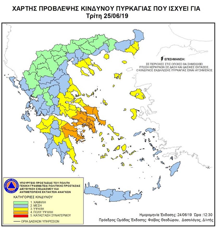 Σύμφωνα με τον Ημερήσιο Χάρτη Πρόβλεψης Κινδύνου Πυρκαγιάς που εκδίδεται από τη Γενική Γραμματεία Πολιτικής Προστασίας (ΓΓΠΠ) προς ενημέρωση των πολιτών προβλέπεται πολύ υψηλός κίνδυνος πυρκαγιάς για τις εξής περιοχές: