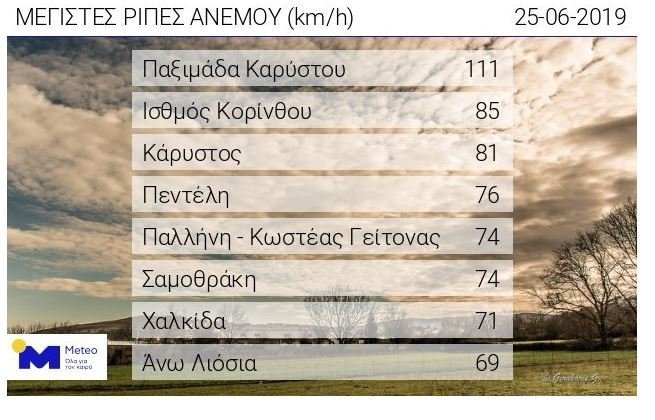 Μάλιστα, στην Παξιμάδα Καρύστου οι ριπές έφτασαν στα 111 χιλιόμετρα/ώρα λίγο πριν τις 4 το μεσημέρι, ενώ ο μετεωρολογικός σταθμός στην Πεντέλη – ΕΑΑ κατέγραψε μέγιστη ριπή ίση με 76 χιλιόμετρα/ώρα στις 5 το απόγευμα.