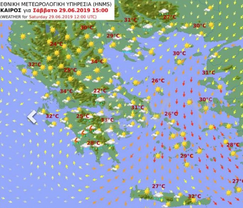 O προγνωστικός χάρτης της ΕΜΥ για τον καιρό που θα επικρατήσει το μεσημέρι του Σαββάτου: