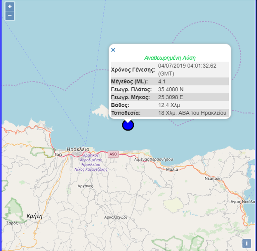 Σύμφωνα με το Γεωδυναμικό Ινστιτούτο ο σεισμός είχε ένταση 4,1 βαθμούς και σημειώθηκε ανοιχτά του Ηρακλείου κοντά στη νήσο Ντία, και συγκεκριμένα σε απόσταση 18 χιλιομέτρων βορειοανατολικά και με εστιακό βάθος μόλις στα 12,5 χιλιόμετρα.