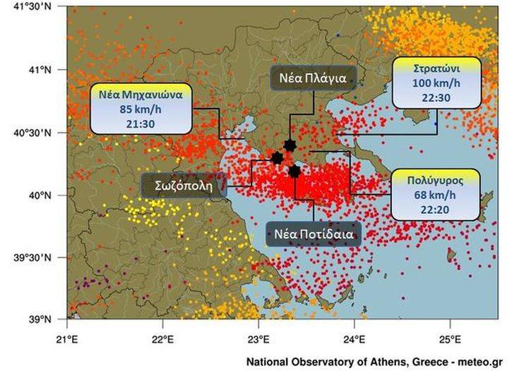 Επισημαίνεται ότι οι ταχύτητες ανέμου που παρουσιάζονται είναι χαμηλότερες από τις ταχύτητες ανέμου που συνόδευαν τις καταιγίδες, καθώς τα ισχυρότερα φαινόμενα έλαβαν χώρα σε πολύ μικρή έκταση όπου δεν υπάρχει κάλυψη από μετεωρολογικό σταθμό. Επιπλέον, τα δεδομένα ορισμένων σταθμών όπως της Κασσάνδρειας, δεν είναι ακόμη διαθέσιμα, λόγω διακοπής ρεύματος.