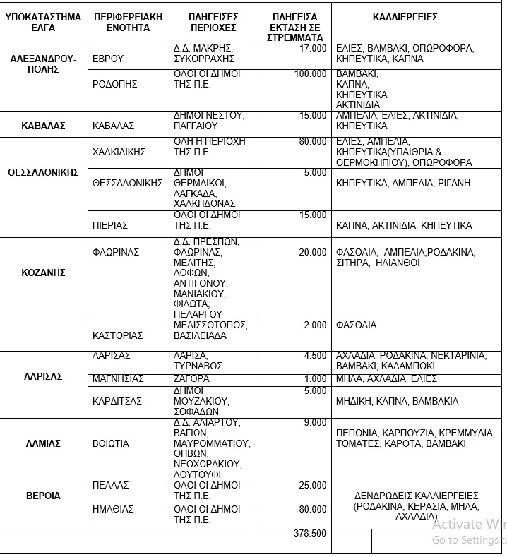Σύμφωνα με τις μέχρι τώρα εκτιμήσεις των ελεγκτών του ΕΛΓΑ, η μεγαλύτερη ζημιά παρατηρείται στην περιφερειακή ενότητα Ροδόπης. Οι εκτάσεις που έχουν πληγεί από το κύμα κακοκαιρίας ανέρχονται σε 100.000 στρέμματα και οι καλλιέργειες που έχουν καταστραφεί είναι βαμβάκι, καπνά, κηπευτικά και ακτινίδια. Ακολουθούν οι περιφερειακές ενότητες Χαλκιδικής και Ημαθίας με 80.000 στρέμματα η κάθε μια. Στη Χαλκιδική έχουν καταστραφεί ελιές, αμπέλια, κηπευτικά και οπωροφόρα, ενώ στη Ημαθία δενδρώδεις καλλιέργειας, όπως ροδακινιές, κερασιές, μηλιές και αχλαδιές.