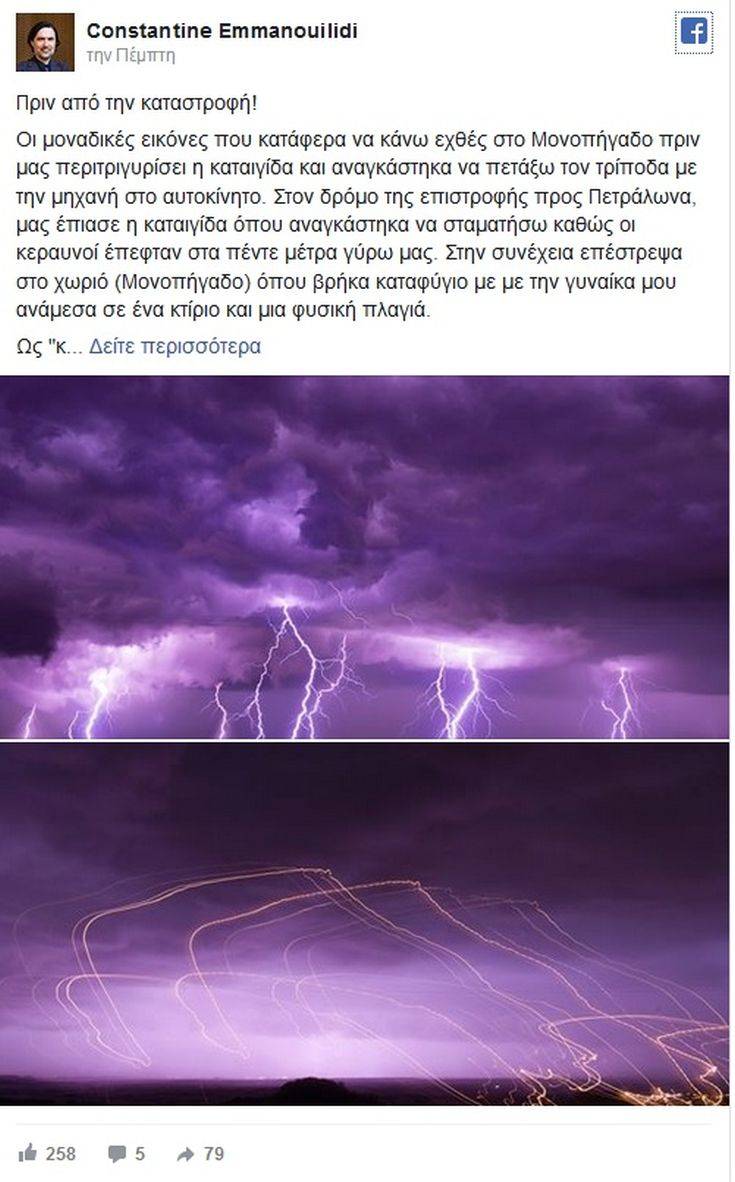 Ο Κωνσταντίνος Εμμανουηλίδης με μία ανάρτηση του στο Facebook περιγράφει τον τρόμο που βίωσε. «Ως “κυνηγός” καταιγίδων έχω βιώσει αρκετά έντονα φαινόμενα όμως αυτό που πέρασε εχθές από την Χαλκιδική είναι απερίγραπτο. Πρώτη φορά έτρεξα για την ζωή μου και σταμάτησα την φωτογράφιση και αργότερα έμαθα τα θλιβερά νέα για νεκρούς αναφέρει χαρακτηριστικά.