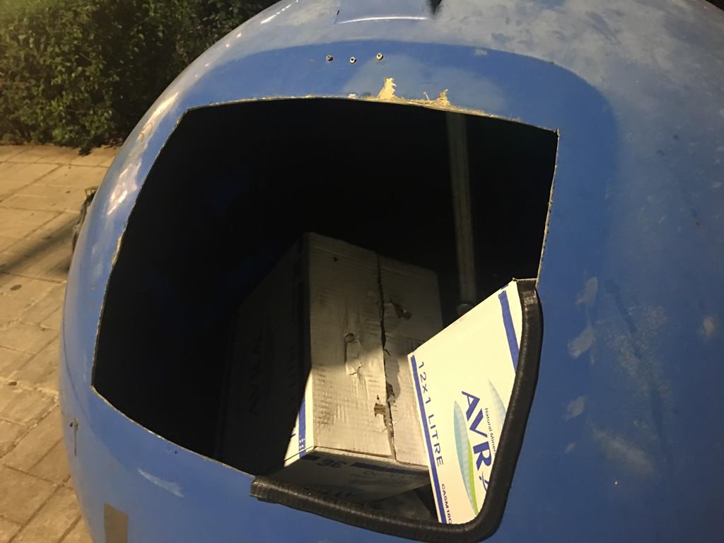Και όμως πετάνε χαρτόκουτα. Λίγα μέτρα πιο πέρα υπάρχει ένας άλλος κάδος που γράφει «χαρτί». Και εκεί μπορεί να πετάνε μπουκάλια.