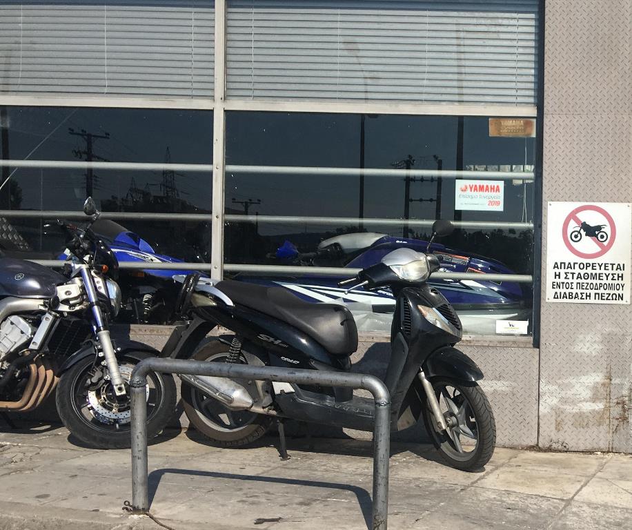 Και σωστά απαγορεύεται γιατί το πεζοδρόμιο είναι μικρό και όταν σταθμεύουν τα δίκυκλα πάνω σε αυτό τότε οι περαστικοί είναι υποχρεωμένοι να κατεβαίνουν στο οδόστρωμα και να κινδυνεύουν από τα διερχόμενα αυτοκίνητα. Φαντασθείτε μια μητέρα με το καροτσάκι αντί να βρίσκεται με ασφάλεια στο πεζοδρόμιο να αναγκάζεται να βγαίνει στο δρόμο επειδή κάποιοι άλλοι το κατέλαβαν.