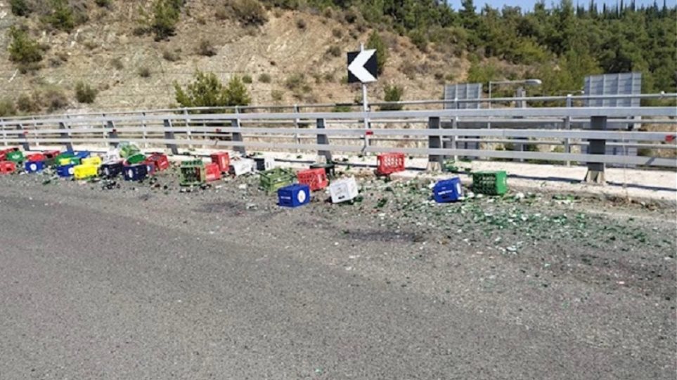 Εκατοντάδες μπύρες έπεσαν στο οδόστρωμα και έγιναν θρύψαλα όταν το φορτηγό που τις μετέφερε μπήκε στη στροφή με μεγάλη ταχύτητα.