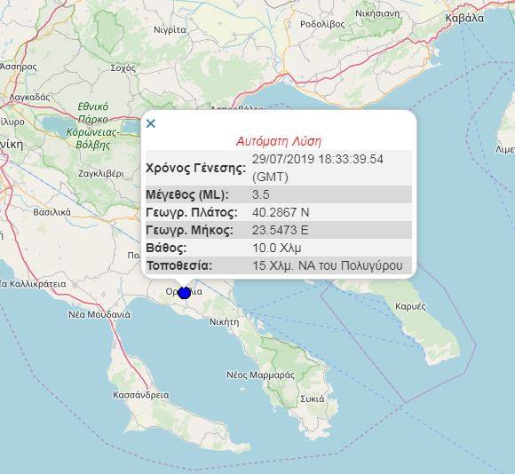 Το Γεωδυναμικό Ινστιτούτο του Εθνικού Αστεροσκοπείου Αθηνών καταγράφει σεισμική δόνηση μεγέθους 3.5 της κλίμακας ρίχτερ, 15 Χλμ. ΝΑ του Πολυγύρου και με εστιακό βάθος 10 χλμ.