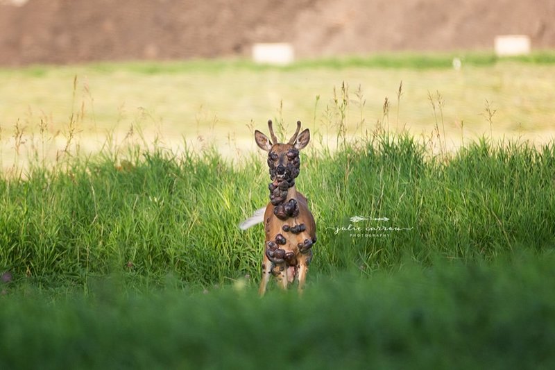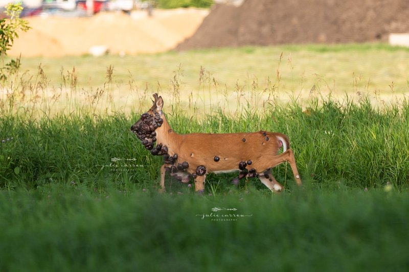 Η Τζούλι Κάροου φωτογράφισε ένα ελάφι το οποίο καλύπτεται από μεγάλους όγκους, προκαλώντας ερωτήματα στο Διαδίκτυο. «Βοσκούσε και δεν φαινόταν υποσιτισμένο, αλλά δεν μπορούσα να δω τα μάτια του», ανέφερε η φωτογράφος.