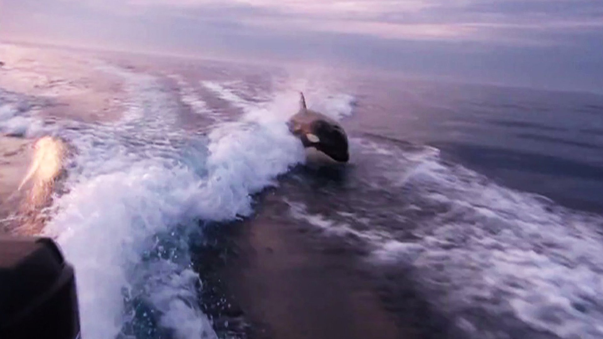 Η φάλαινα δολοφόνος φαίνεται να ακολουθεί επί δέκα λεπτά την βάρκα βγάζοντας το κεφάλι της συχνά από το νερό και προκαλώντας την αντίδραση των ψαράδων.