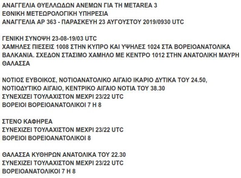 Το πρωί της Παρασκευής η ΕΜΥ εξέδωσε έκτακτο δελτίο θυελλωδών ανέμων. Σύμφωνα με αυτό, κατά τη διάρκεια της ημέρας θα πνέουν άνεμοι ισχύος 7 έως και 8 μποφόρ σε: νότιο Ευβοϊκό, νοτιοανατολικό Αιγαίο, νοτιοδυτικό Αιγαίο, κεντρικό Αιγαίο, στενό Καφηρέα και θάλασσα Κυθήρων.