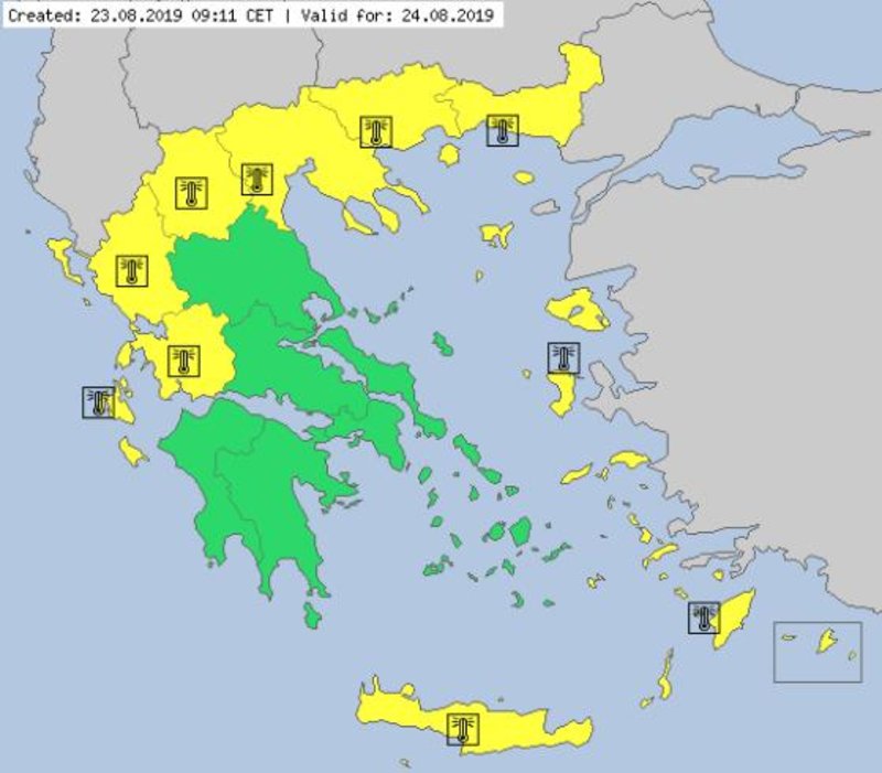 Σύμφωνα με τον χάρτη προειδοποίησης που εξέδωσε το Meteo Alarm, του Ευρωπαϊκού Δικτύου Μετεωρολογικών Υπηρεσιών, «εξαιρετικά υψηλές θερμοκρασίες» αναμένονται το Σάββατο σε όλη τη Μακεδονία και τη Θράκη, την Ηπειρο, το βορειοανατολικό Αιγαίο, τα Δωδεκάνησα, το Ιόνιο, και την Κρήτη.