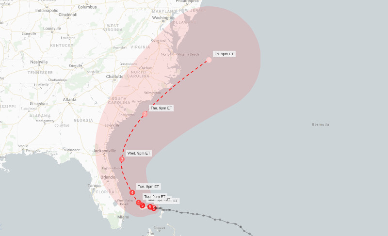 Στις ΗΠΑ αναμένουν τον τυφώνα την Δευτέρα το βράδυ, με τις Πολιτείες της Φλόριντα, της Τζόρτζια και της Νότιας Καρολίνας, να είναι σε κατάσταση έκτακτης ανάγκης. Μάλιστα, ο κυβερνήτης της Νότιας Καρολίνας, έδωσε εντολή για άμεση και υποχρεωτική εκκένωση του νότιου τμήματος της Πολιτείας, ενώ σε άλλες περιοχές οι κάτοικοι οχυρώνουν τα σπίτια τους και αδειάζουν τα ράφια σε σούπερ μάρκετ.