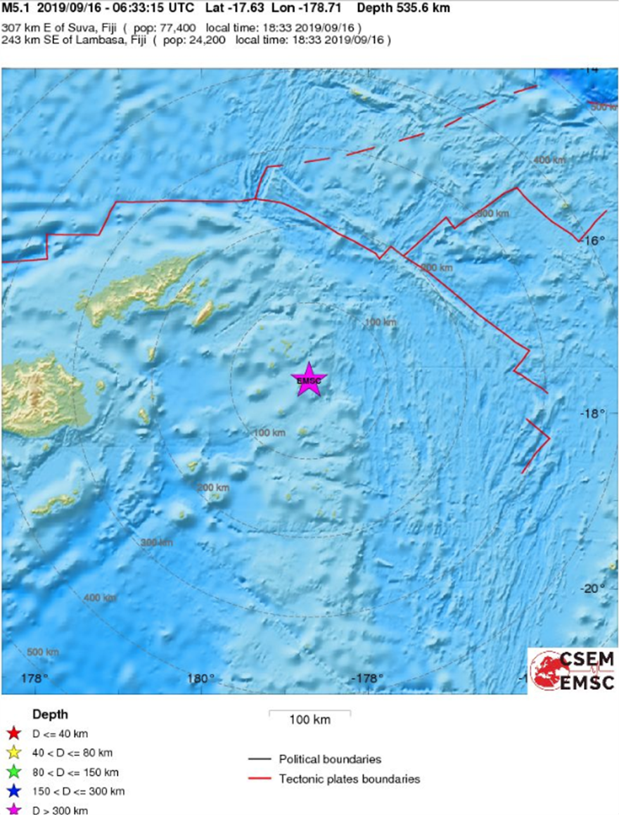 Το εστιακό βάθος του μεγάλου σεισμού, σύμφωνα με το Ευρωμεσογειακό Ινστιτούτο ορίζεται στα 536 χιλιόμετρα, με το επίκεντρο του σεισμού να προσδιορίζεται στα 243 χιλιόμετρα από τη πόλη Λάμπασα των νησιών Φίτζι.