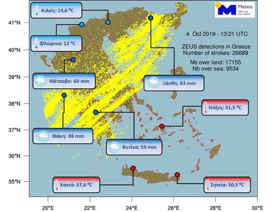 Ισχυρές βροχές, καταιγίδες και χαλαζοπτώσεις εκδηλώθηκαν και εξακολουθούν να εκδηλώνονται σε πολλές περιοχές. Σύμφωνα με το βροχόπτωσης δίκτυο αυτόματων μετεωρολογικών σταθμών που έχει στη διάθεσή του το Εθνικό Αστεροσκοπείο Αθηνών / meteo.gr , τα μεγαλύτερα ύψη βροχής καταγράφονται στην Ιθάκη με 86 χιλιοστά και στην Ξάνθη με 83 χιλιοστά.