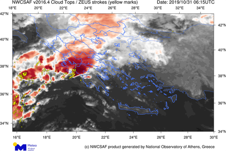 Χαρακτηριστική είναι η εικόνα του μετεωρολογικού δορυφόρου Meteosat-11 που ακολουθεί, όπου φαίνονται οι νεφώσεις που καλύπτουν την ελληνική επικράτεια στις 08:15 ώρα Ελλάδας, καθώς και οι κεραυνοί που καταγράφηκαν στο διάστημα 07:45-08:15 από το σύστημα καταγραφής κεραυνών «ΖΕΥΣ» του Εθνικού Αστεροσκοπείου Αθηνών.