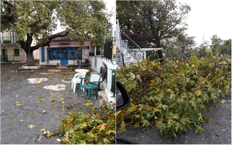 Από τα έντονα καιρικά φαινόμενα έσπασαν πολλά κλαδιά από το μεγάλο πλάτανο που βρίσκεται στην πλατεία του χωριού, ενώ τραπεζοκαθίσματα από μαγαζί της περιοχής παρασύρθηκαν. Την ίδια ώρα εκτεταμένες ζημιές σημειώθηκαν και στην ευρύτερη περιοχή (Χορεύτρα κ.α.) στις ελαιοκαλλιέργειες.